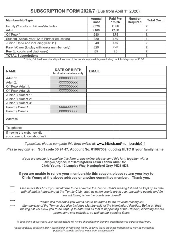 If you are not able to do this please post a cheque made payable to “Hemingfords Lawn Tennis Club” to